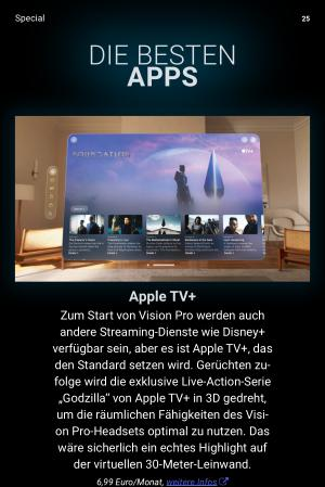 Apple TV + Zum Start von Vision Pro werden auch andere Streaming-Dienste wie Disney + verfügbar sein , aber es ist Apple TV +, das den Standard setzen wird . Gerüchten zufolge wird die exklusive Live-Action-Serie „ Godzilla “ von Apple TV + in 3D gedreht , um die räumlichen Fähigkeiten des Vision Pro-Headsets optimal zu nutzen . Das wäre sicherlich ein echtes Highlight auf der virtuellen 30-Meter-Leinwand .