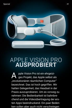 Kleine Abzüge gibt es für den Akku , denn der Stromspender ist extern und hat etwa die Größe eines iPhones – überschaubar , aber in der Tasche deutlich spürbar . Akkulaufzeit : etwa zwei Stunden . Trotz des hohen Preises weiß die Apple Vision Pro zu überzeugen : durch intuitive Bedienung , ein realistisches Video-Pass-Through-Erlebnis , die durchdachte , controllerfreie Benutzeroberfläche und die immersive Videowiedergabe . Kleine Schwächen gibt es bei EyeSight und dem Persona-Avatar . Wir sind gespannt auf die finale Version !