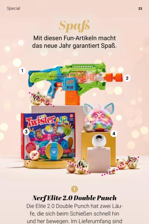 1 Nerf Elite 2.0 Double Punch Die Elite 2.0 Double Punch hat zwei Läufe , die sich beim Schießen schnell hin und her bewegen . Im Lieferumfang sind 50 Pfeile enthalten . Das mag auf den ersten Blick übertrieben erscheinen . Die Zahl relativiert sich jedoch , wenn man die Schussgeschwindigkeit von sieben Pfeilen pro Sekunde bedenkt , die batteriebetrieben abgeschossen werden . Preis : 20 Euro , weitere Infos �