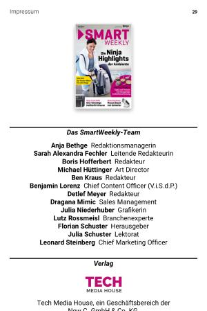 Tech Media House , ein Geschäftsbereich der New C . GmbH & Co . KG , Alte Dorfstraße 14 , 23701 Süsel-Zarnekau www . new-c . de E-Mail : redaktion @ smart-weekly . de Geschäftsführer : Wolfgang Heinen und Florian Schuster