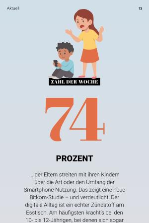 ... der Eltern streiten mit ihren Kindern über die Art oder den Umfang der Smartphone-Nutzung. Das zeigt eine neue Bitkom-Studie – und verdeutlicht: Der digitale Alltag ist ein echter Zündstoff am Esstisch. Am häufigsten kracht’ s bei den 10- bis 12-Jährigen, bei denen sich sogar 88 Prozent der Eltern über Dauer, Apps oder Inhalte in die Haare bekommen. Besonders beängstigend: 14 Prozent halten ihr Kind bereits für smartphonesüchtig! Das Smartphone wird auch als Druckmittel eingesetzt: Fast die Hälfte( 48 Prozent) der Eltern kassiert das Handy als Strafe ein. Medienkompetenz ist eindeutig ein wichtiges Familienprojekt.