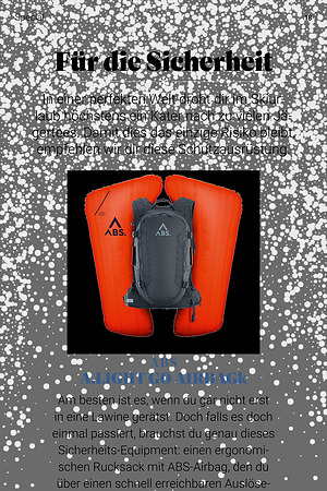 Am besten ist es, wenn du gar nicht erst in eine Lawine gerätst. Doch falls es doch einmal passiert, brauchst du genau dieses Sicherheits-Equipment: einen ergonomischen Rucksack mit ABS-Airbag, den du über einen schnell erreichbaren Auslösegriff sofort aktivieren kannst. Preis: 600 Euro, weitere Infos �