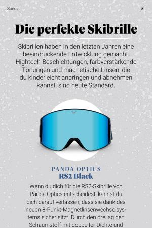 Wenn du dich für die RS2-Skibrille von Panda Optics entscheidest, kannst du dich darauf verlassen, dass sie dank des neuen 8-Punkt-Magnetlinsenwechselsystems sicher sitzt. Durch den dreilagigen Schaumstoff mit doppelter Dichte und Fleece-Finish ist sie zudem unglaublich