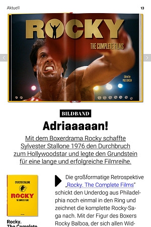 „ Rocky. The Complete Films“ versammelt sämtliche Höhepunkte und Tiefschläge der Rocky-Saga. Eine Fülle an Bildern, darunter viele Aufnahmen des berühmten Sportfotografen Neil Leifer, die während der Dreharbeiten entstanden, werden durch rares Archivmaterial aus der Bibliothek der Filmakademie und dem MGM-Archiv ergänzt. Ein Vorwort von Stallone und zahlreiche Interviews, die er im Laufe seiner Karriere gab, lassen die Entwicklung des Helden und der außergewöhnlichen Filmreihe nachverfolgen.