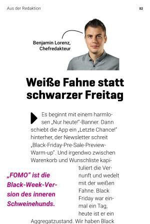 Das Verrückte: Wir sind nicht mal unvernünftig, nur überlistet. FOMO( Fear of missing out) – also die Sorge, etwas zu verpassen – ist die Black-Week-Version des inneren Schweinehunds. „ Du sparst 200 Euro“, flüstert der Banner. „ Worauf?“, fragt das Konto. Und irgendwo murmelt die Umwelt: „ Noch ein Paket mehr, ich halte das schon.“ Rücksendungen? Unser heimlicher Teamsport in der Vorweihnachtszeit. Karton-Tetris in der Diele, Klebeband als ASMR. Hach, Black- Friday-Week-Month-Weihnachts- Shopping-Wahnsinn – wir lieben dich, wir hassen dich...