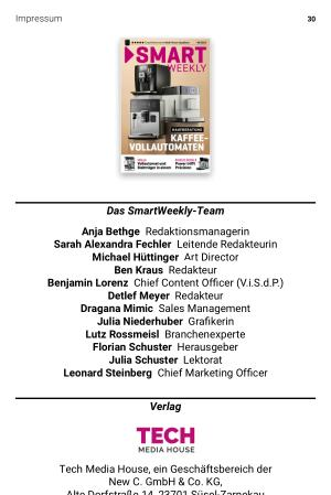 Tech Media House, ein Geschäftsbereich der New C. GmbH & Co. KG, Alte Dorfstraße 14, 23701 Süsel-Zarnekau www. new-c. de E-Mail: redaktion @ smart-weekly. de Geschäftsführer: Wolfgang Heinen und Florian Schuster