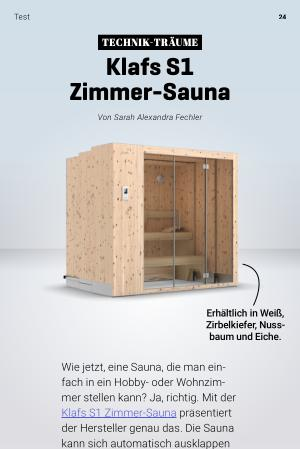 Wie jetzt , eine Sauna , die man einfach in ein Hobby- oder Wohnzimmer stellen kann ? Ja , richtig . Mit der Klafs S1 Zimmer-Sauna präsentiert der Hersteller genau das . Die Sauna kann sich automatisch ausklappen und wieder einfahren . So ist die Sauna eingeklappt gerade einmal 60 Zentimeter groß und kann auf 160 Zentimeter ausgefahren werden . In der Länge gibt es gleich drei Größen zwischen 150 und 210 Zentimetern zur Auswahl . Und was darf das stylische Möbelstück ( wenn man es so nennen möchte ) kosten ? Ab 10.000 Euro gehört es dir .