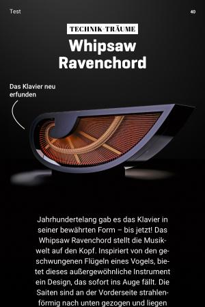 Jahrhundertelang gab es das Klavier in seiner bewährten Form – bis jetzt ! Das Whipsaw Ravenchord stellt die Musikwelt auf den Kopf . Inspiriert von den geschwungenen Flügeln eines Vogels , bietet dieses außergewöhnliche Instrument ein Design , das sofort ins Auge fällt . Die Saiten sind an der Vorderseite strahlenförmig nach unten gezogen und liegen neben den Hämmern und Dämpfern offen . Das sieht nicht nur futuristisch aus , sondern sorgt auch für ein faszinierendes visuelles Erlebnis : Jede Saite leuchtet sanft auf , wenn sie angeschlagen wird . So wird das Spielen des Ravenchords zu einem multisensorischen Erlebnis , das nicht nur das Ohr , sondern auch das Auge anspricht .