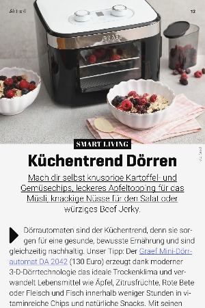 Graef Mini-Dörrautomat DA 2042 ( 130 Euro ) erzeugt dank moderner 3-D-Dörrtechnologie das ideale Trockenklima und verwandelt Lebensmittel wie Äpfel , Zitrusfrüchte , Rote Bete oder Fleisch und Fisch innerhalb weniger Stunden in vitaminreiche Chips und natürliche Snacks . Mit seinen kompakten Abmessungen ( 27,2 x 29 x 21 cm ) passt der Dörrprofi sogar in kleinere Küchen . Und auch alle Hobbygärtner kommen im wahrsten Sinne des Wortes auf den Geschmack : Wer im eigenen Garten Gemüse , Obst oder Kräuter anbaut , kann die frischen Produkte problemlos haltbar machen – ganz ohne Konservierungsstoffe , künstliche Farb- oder Aromastoffe sowie ohne überschüssiges Salz . Dazu verwandelt der Dörrautomat nicht nur Snacks in optische Highlights , sondern ist auch selbst ein stylischer Hingucker in jeder Küche .