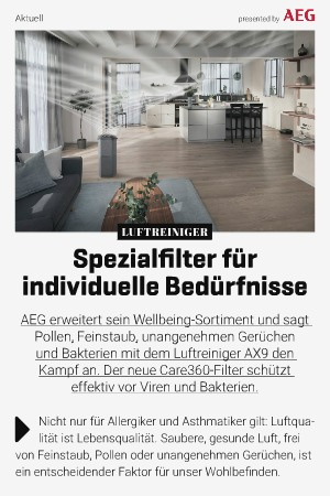 AEG erweitert sein Wellbeing-Sortiment und sagt Pollen , Feinstaub , unangenehmen Gerüchen und Bakterien mit dem Luftreiniger AX9 den Kampf an . Der neue Care360-Filter schützt effektiv vor Viren und Bakterien .