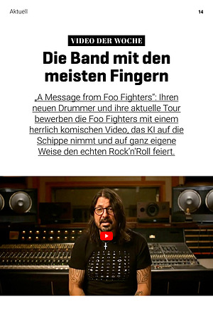 „ A Message from Foo Fighters“: Ihren neuen Drummer und ihre aktuelle Tour bewerben die Foo Fighters mit einem herrlich komischen Video, das KI auf die Schippe nimmt und auf ganz eigene Weise den echten Rock’ n’ Roll feiert.