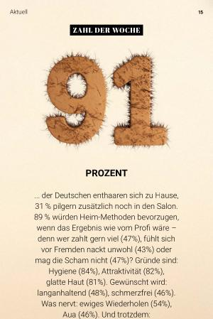 ... der Deutschen enthaaren sich zu Hause, 31 % pilgern zusätzlich noch in den Salon. 89 % würden Heim-Methoden bevorzugen, wenn das Ergebnis wie vom Profi wäre – denn wer zahlt gern viel( 47 %), fühlt sich vor Fremden nackt unwohl( 43 %) oder mag die Scham nicht( 47 %)? Gründe sind: Hygiene( 84 %), Attraktivität( 82 %), glatte Haut( 81 %). Gewünscht wird: langanhaltend( 48 %), schmerzfrei( 46 %). Was nervt: ewiges Wiederholen( 54 %), Aua( 46 %). Und trotzdem: 89 % rasieren weiter.