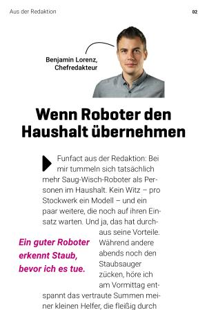 Meine aktuellen Favoriten: der Dreame X50 Ultra, der auch in unserem großen Test dieser Ausgabe überzeugt – ein echtes Kraftpaket mit starker Selbstreinigung – und der Narwal Flow, der mit seinem innovativen Konzept frischen Wind in den Markt bringt. Beide stehen sinnbildlich für den Wandel: mehr Intelligenz, mehr Komfort, weniger Aufwand. Vielleicht ist es also gar nicht so verrückt, wenn sich bei mir mehr Roboter als Mitbewohner um den Boden kümmern. Schließlich – und das ist das Beste daran: Sie machen nie Streit, nur sauber.
