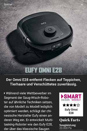 Segment der Saug-Wisch-Roboter auf ähnliche Techniken setzen, die von Modell zu Modell lediglich optimiert werden, schlägt der chinesische Hersteller Eufy einen anderen Weg ein. Er entwickelt Multitasking-Roboter wie den Eufy E28, der über das klassische Saugen und Wischen hinausgeht. Dieser 3-in-1-Haushaltshelfer überzeugt durch seine außergewöhnliche Bauform. Neben einer effizienten Bodenreinigung und einem leistungsstarken Wischsystem verfügt er über einen abnehmbaren Tiefenreiniger für Flecken auf Teppichen und Polstermöbeln.