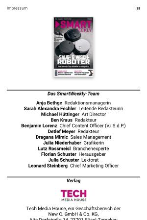Tech Media House, ein Geschäftsbereich der New C. GmbH & Co. KG, Alte Dorfstraße 14, 23701 Süsel-Zarnekau www. new-c. de E-Mail: redaktion @ smart-weekly. de Geschäftsführer: Wolfgang Heinen und Florian Schuster