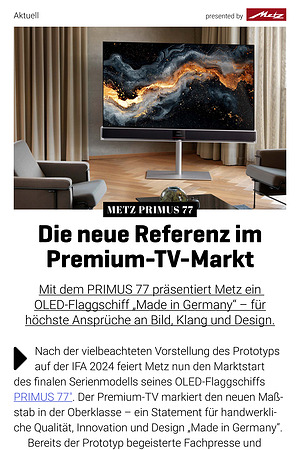 Nach der vielbeachteten Vorstellung des Prototyps auf der IFA 2024 feiert Metz nun den Marktstart des finalen Serienmodells seines OLED-Flaggschiffs PRIMUS 77 ″. Der Premium-TV markiert den neuen Maßstab in der Oberklasse – ein Statement für handwerkliche Qualität, Innovation und Design „ Made in Germany“. Bereits der Prototyp begeisterte Fachpresse und Handel gleichermaßen. Dieses positive Feedback nutzte Metz, um den PRIMUS 77 ″ gezielt weiterzuentwickeln und zur Serienreife zu bringen. Das Ergebnis ist ein Fernseher, der modernste Display- und Audiotechnologie in einem eleganten, hochwertigen Gehäuse vereint.